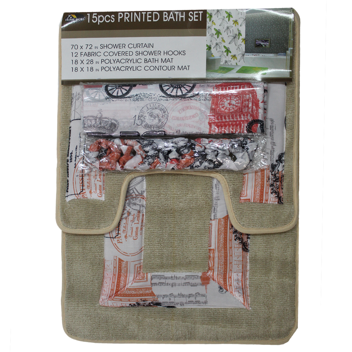 70 X 72 IN SHOWER CURTAIN 12 FABRIC COVERED SHOW HOOKS 18 X 28 IN POLY ACRYLIC BATH MAT 18 X 18 IN POLY ACRYLIC CONTOUR MAT