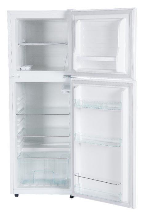 Transparent shelves 128 litres Direct Cool technology Double door fridge 120W rating Freezer door compartment Height: 127cm Width: 45cm Depth: 49cm